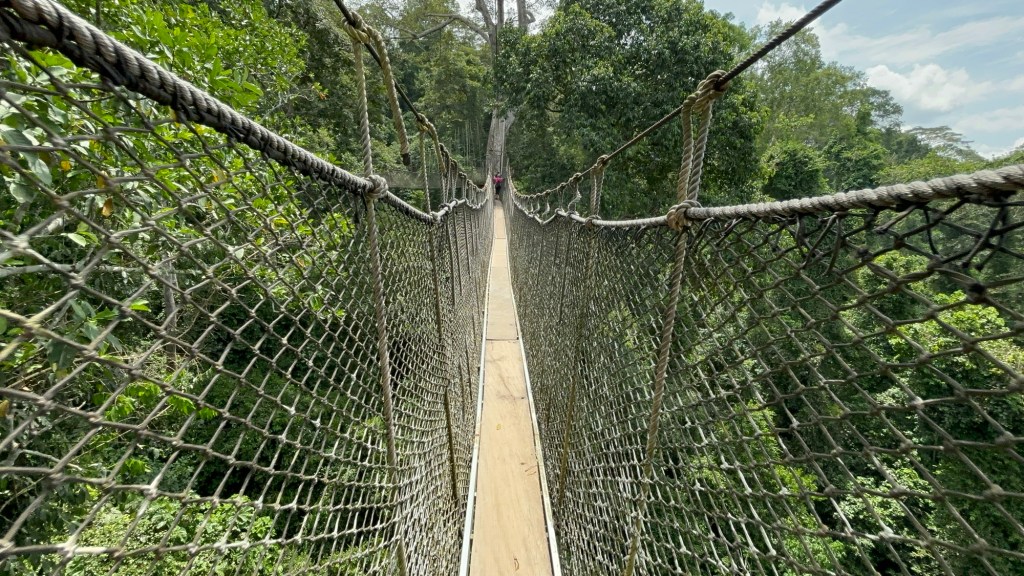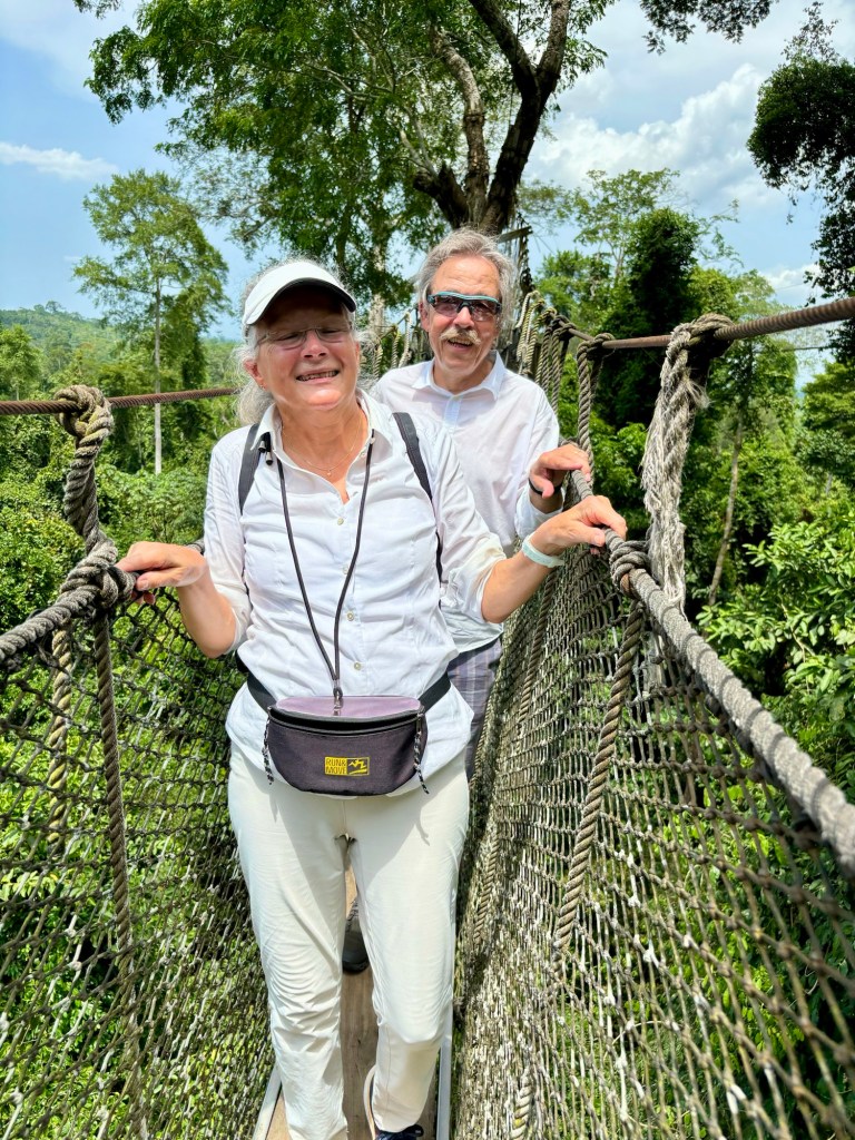 Die Fremdenführerin des Nationalparks erklärte uns vor dem Überqueren der Hängebrücken Fauna und Flora.Maximal 40 – 60 M. über Grund schwankte es zwar teils sehr, aber die Konstruktion machte einen sehr soliden Eindruck. Ruth war zum ersten Mal auf solch einer Hängebrücke.Die Hängebrücken-Tour beginntund endet erfolgreich.