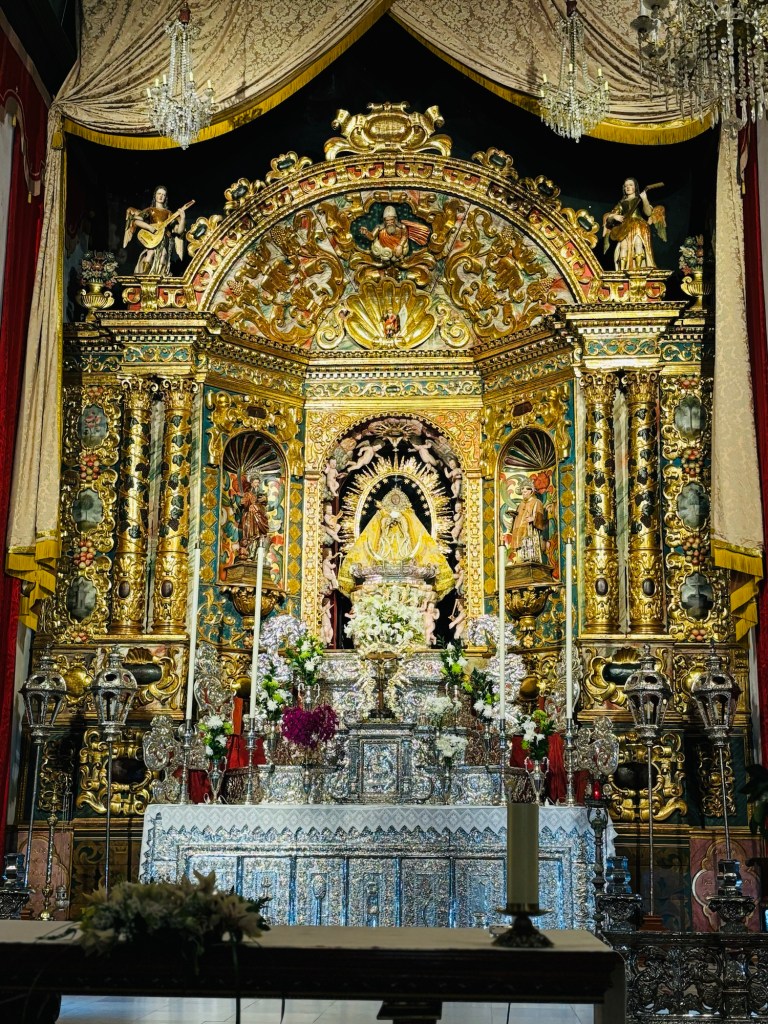 Eine Satellitenaufnahme bei welcher man die einzelnen Krater gut erkennen kann. Das Weisse beim Ufer links sind durch Tücher vom Wind geschützte Bananenplantagen.Alle Kanarischen Inseln; La Palma links oben.Blick von einem Aussichtspunkt im Nationalpark auf 1‘200 M.ü.M. hinunter in die Caldera. Es sieht ein wenig so aus wie z.B. im Bündnerland. Der höchste Berg auf dem Bild ist rund 2‘200 M.ü.M. Ein Blick auf die Abhänge, die allesamt aus Lavastein bestehen. Das Dorf und die Gegend ähneln dem Lavaux am Genfersee.Der Krater eines Vulkans, der vor 400 Jahren aktiv war. Auf dem Rückweg machten wir Halt in einer Kirch mit diesem wunderschönen Altar. Sie ist der Heiligen Jungfrau des Schnees gewidmet.Ein Teil des Hafens, wo unser Schiff wartet.