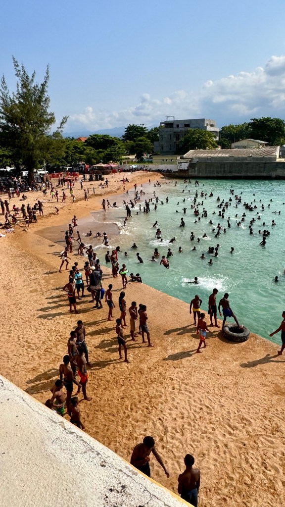Ein offensichtlich beliebter Badestrand gleich neben dem Containerhafen. Viele Kinder und Jugendliche waren hier.Unter diesem Baum war die einzige, einigermassen valable Schattenquelle.