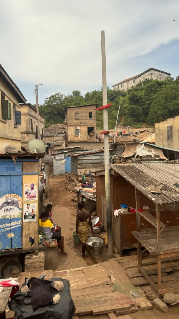 Wir fuhren um 09.30h mit einem Bus 107KM in den Kakum Nationalpark für eine Wanderung in jenen Regenwald, der sich im Landesinnern befindet, inkl. dem Überqueren von sieben Hängebrücken, dem so genannten „Kanopy Walkway“. Das Fahren durch grössere und kleinere Dörfer auf tendenziell schlechten Strassen mit tausenden von Schlaglöchern war ein Erlebnis für sich. Wir hatten eine Polizei-Eskorte, die die teils verstopften Strassen für unseren Bus rigoros frei räumte. Obwohl Ghana 1957 das erste westafrikanische Land war, das die Eigenständigkeit – von den Engländern – erlangen konnte, macht es auf mich den Eindruck, dass es seither keine grossen Sprünge mehr gemacht hat.