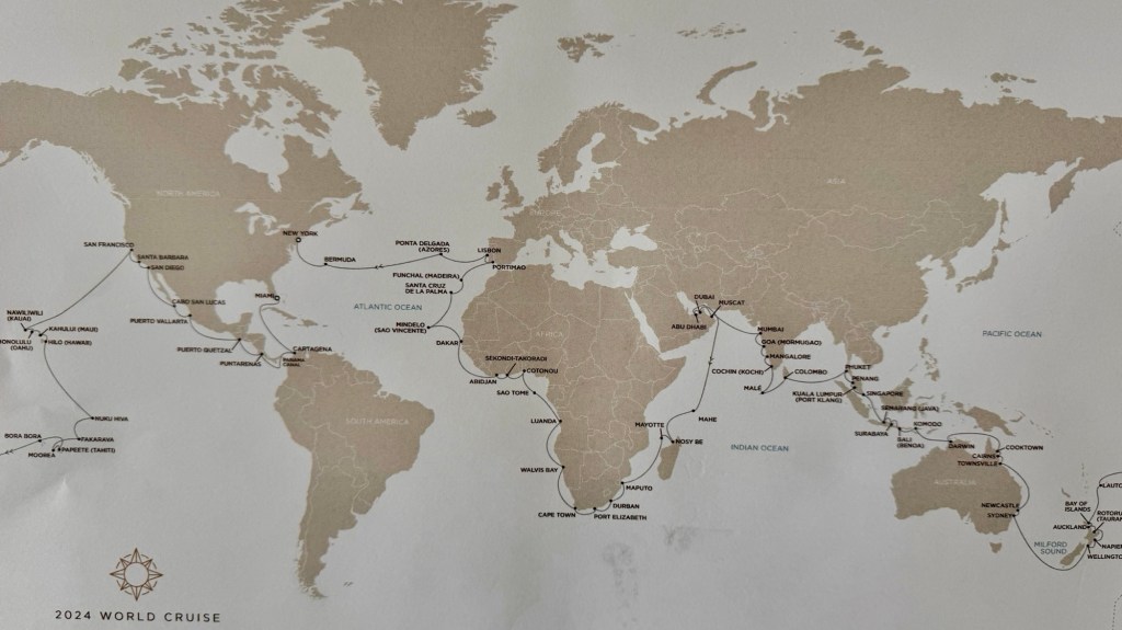 Auf dieser Reise rund um die Welt gab es insgesamt 8 Teilabschnitte, die einzeln gebucht werden konnten. Zwischen 100 bis 150 Personen stiegen so in den acht Fixstationen ein und aus. Die restlichen rund 380 Passagiere – so auch wir – waren von Anfang bis (fast) zu Ende an Bord. Da die Route wegen der Unruhen im Roten Meer abgeändert wurde, und die Mariner anstatt durchs Mittelmeer rund um Afrika fuhr, verliessen wir – und viele Andere auch – das Schiff – der kürzeren Heimreise wegen zumindest für Europäer – schon in Lissabon. Die andere Hälfte beendete die Fahrt in USA, allerdings nicht am Ausgangspunkt Miami, sondern der Endhafen der World-Tour 24 anfangs Juni war in New York. Schätzungsweise 80% der „World Cruisers“ waren Nordamerikaner (USA / Kanada). Der Rest verteilte sich auf GB/Australien/Deutschland/Frankreich/Brasilien/Mexiko usw. Aus der Schweiz waren wir während fast der gesamten Reise insgesamt vier Personen. Auf Teilabschnitten kam das eine oder andere Paar aus der Schweiz hinzu. Naturgemäss, wohl der gemeinsamen Muttersprache wegen, hatten wir mit Schweizer(innen) den meisten Kontakt. Allerdings nicht mit allen. So gab es auf einem Teilabschnitt ein CH-Paar, mit dem wir ausser „Guten Tag“ und „Adieu“ fast keinen anderen Austausch hatten. Die engsten Beziehungen pflegten wir mit Regula und Günter, die von Miami bis Kapstadt an Bord waren. Wir ticken in vielen Themen exakt gleich und so war Gemeinsames weit stärker präsent als Trennendes. Wir werden nach der Reise weiterhin in Kontakt bleiben. Wohl ebenfalls der Sprache wegen pflegten wir lockere Bekanntschaften mit Leuten aus Deutschland wie z.B. mit Petra und Peter oder Inge und Jörg resp. Ilona und Volker, was durchaus erbaulich war. Hingegen waren vertiefende Kontakte mit Nordamerikanern schwierig. Letztlich blieb es höchstens bei verallgemeinerten Floskeln. Trotz meiner guten – vielleicht sogar sehr guten – „english-skills“ fehlte irgendwie das letzte i-Tüpfelchen. Im Laufe der Zeit wurde die „Cameraderie“ unter den Nordamerikanern sehr ausgeprägt; man sass in Gruppen zusammen, scherzte, lachte, hatte eine gute Zeit usw.. Scherzen und Sprüche klopfen in einer Fremdsprache ist mit das Schwierigste und fehlt mir eindeutig. Somit war es fast unmöglich, in diese Kreise mitaufgenommen zu werden.