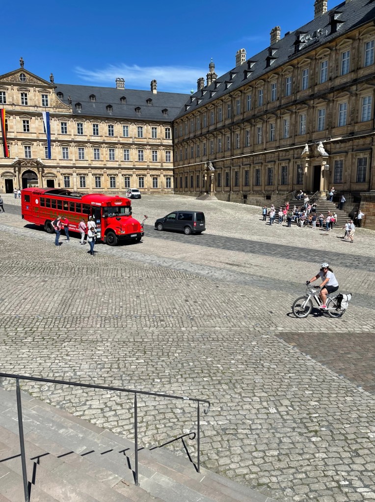 In Bamberg am Samstagmorgen hatten wir Mühe, einen Elektroladeparkplatz zu finden, weil derjenige, der laut Plan am besten gelegen war, entpuppte sich als abgesperrte Baustelle und eine Alternative war schwer zu finden. Die Altstadt von Bamberg ist malerisch und – weil fast 100% katholisch – gibt es einige Kirchen und einen grossen Domplatz.