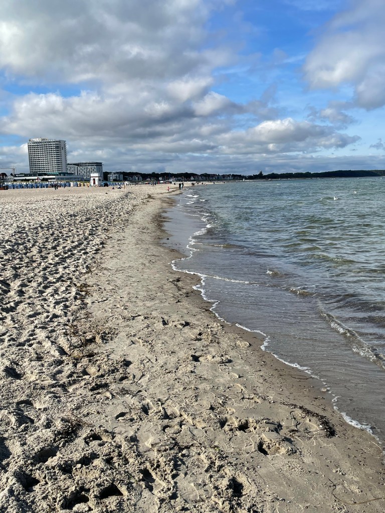 Heute haben wir keinen Ausflug gebucht sondern sind während rund drei Stunden buchstäblich “auf eigenen Füssen” unterwegs. Warnemünde ist ein klassisches Ostseebad. Es gibt mit dem West – und dem Oststrand zwei kilometerlange Sandstände. Dort hat es u.A. spezielle Abschnitte für Hunde, für FKK-Liebhaber(innen) und natürlich Strandkörbe so weit das Auge reicht. Am Vormittag schlendern und stapfen wir auf dem Weststrand der vom berühmten Neptun-Hotel beherrscht wird. Gebaut 1971, ein Prestigeobjekt der DDR, das luxuriöseste Hotel Ostdeutschlands zu jener Zeit. Vornehmlich Stasi-Kader und ihre Familien waren die Gäste jenes über 300 Zimmer zählenden Hotels. Auch heute ist es noch ein 5-Stern Hotel mit großem Wellness Bereich etc.. Optisch jedoch vermag es trotz umfassender Renovierung sein sozialistisches Antlitz irgendwie nicht zu verbergen.