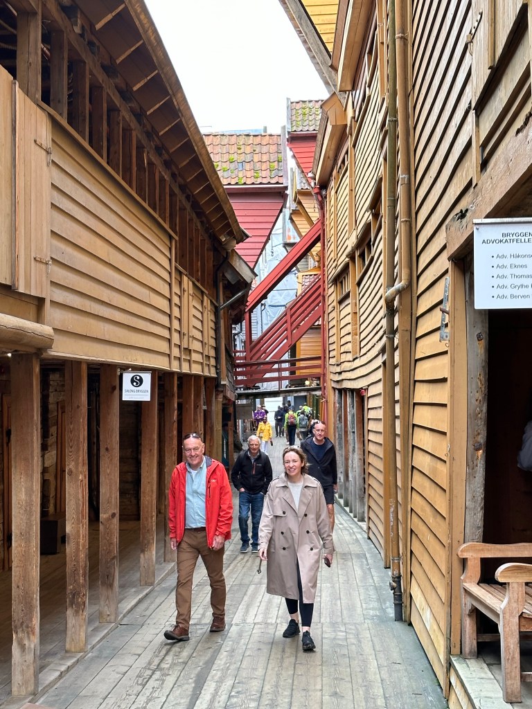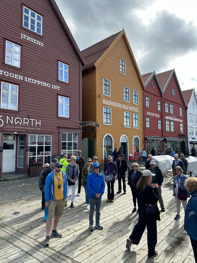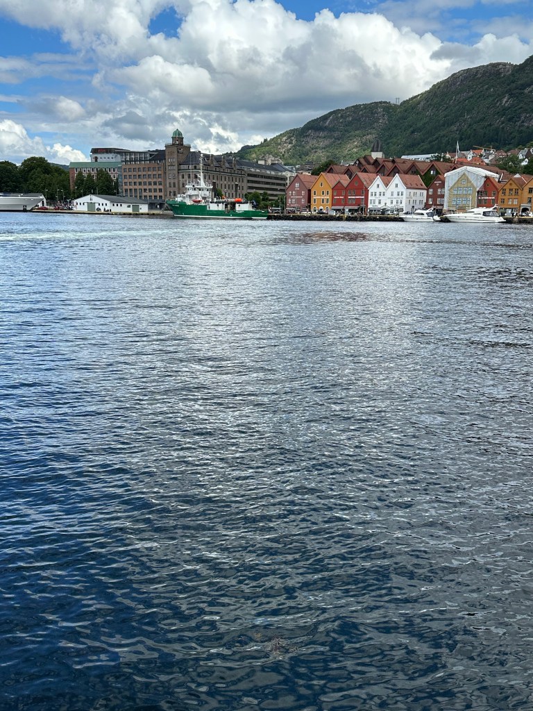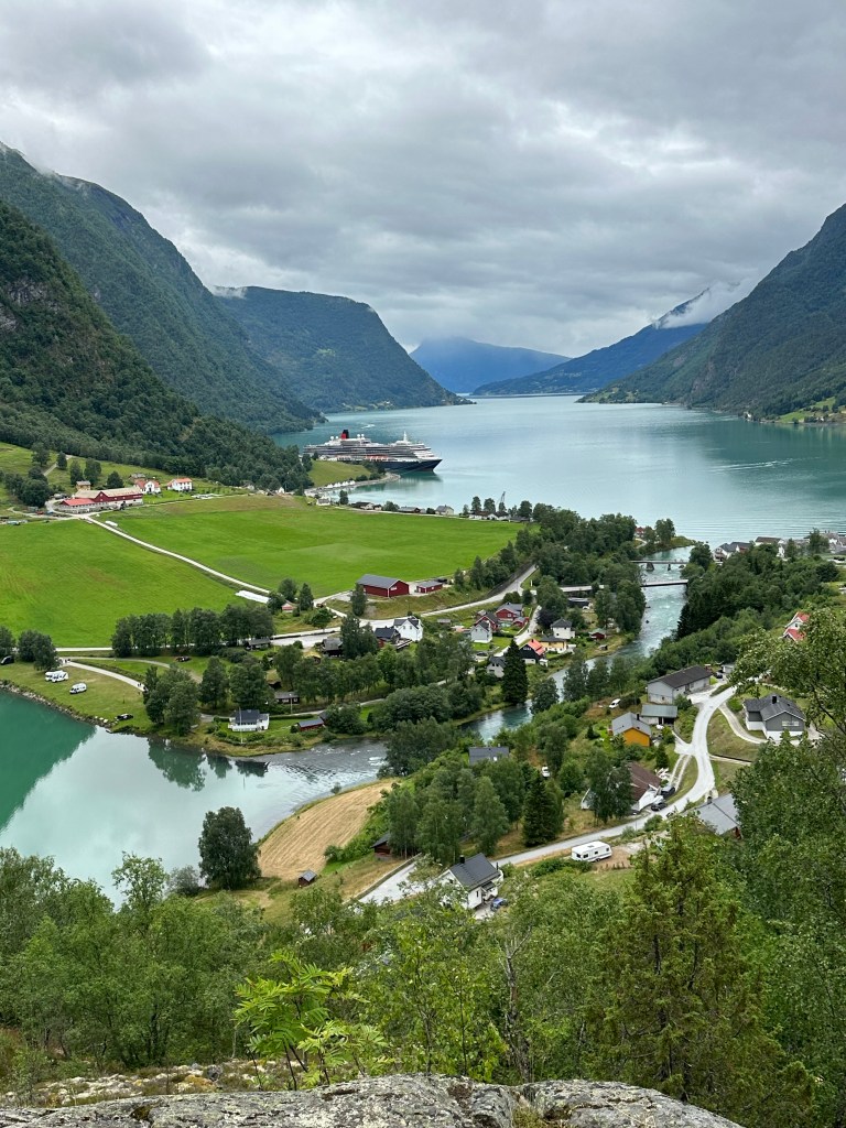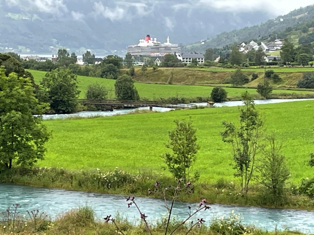 Das Thema rund um‘s Wetter spielte während dieser Woche eine (zu) grosse Rolle. Gab es ironischerweise sowohl auf der Hinfahrt wie auf der Rückfahrt während je eines Seetages von/nach Norwegen schöne, teils sonnige Phasen, empfingen uns die Fjorde mit dichten Wolken und teils anhaltendem Regen bei Temperaturen zwischen 12° und 15°. Der Vergleich, wo jemand über ein verlängertes Wochenende Zermatt gebucht hat, und dabei des schlechten Wetters wegen das Matterhorn nie zu sehen bekommt, kam in mir hoch. Die Schönheit der Fjord- Landschaft im Norden liess sich gut erahnen, manchmal gab es sogar eine Regenpause und ganz selten blinzelte gar kurz die Sonne durch. Wir hatten in weiser Voraussicht mit Ausnahme in der Stadt Bergen keine Touren im Voraus gebucht. Die Aussicht, in einem Bus mit 38 Anderen im Wolkengrau herumzufahren und lediglich an nebelverhangenen „view points“ anzuhalten, dafür happige >$ 90 p.P. zu zahlen, schreckte ab. So waren Ruth und ich sowohl in Haugesund wie auch in Skjolden und Olden jeweils solo zu Fuss unterwegs. Einige Bilder davon finden sich nachstehend. In Bergen freuten wir uns über die Aussicht einer geführten, flotten „Nordic Walking Tour“. Enttäuschender Weise entpuppte es sich allerdings als Stadttour langsamen Schrittes, wo die „walking sticks“ nur hinderlich waren. Zudem waren gleich 2 Schiffe in Bergen, und somit quollen wohl mehr als 4‘000 Leute gleichzeitig durch die historischen Plätze der zweitgrössten Stadt Norwegens. Auf unserem Schiff fanden wir die vertrauten Cunard-Standards mitsamt eines top-ausgerüsteten Fitness-Centers, aber auch gewisse nervige Kleinigkeiten, alles in allem jedoch nicht der Rede wert. Diese Zeilen schreibe ich auf der Rückfahrt von Norwegen nach Southampton. Dort verbringen wir morgen Sonntag den Tag und planen den Besuch des Schifffahrtsmuseums. Am Montag wieder ein Seetag auf der Fahrt nach Hamburg, wo wir am Dienstagmorgen das Schiff verlassen, und mit dem ICE zurück nach Basel fahren. Trotz der widrigen Wetterumstände ziehen wir insgesamt ein positives Fazit aus dieser Reise.