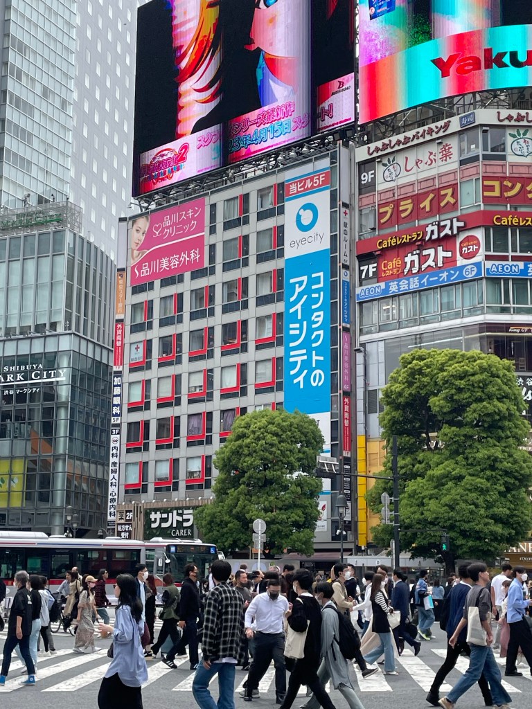 Das Ausschiffen verlief relativ zügig und selbst die Grenzkontrolle war speditiv. Später per Taxi zu unserem Hotel (Nikko Grand, Daiba) zeigt sich bereits das enorme Verkehrsaufkommen, vor allem wegen des Schwerverkehrs. Als Tourist bewegt man sich in dieser Stadt am besten mittels dem weit verzweigten und alles in allem hervorragend funktionierenden Bahnsystems. So gelangten wir in ca. 45 Min. von unserem Hotel erstmal nach Shibuya. Das ist der Platz mitten im Herzen der Stadt, den man im TV immer im Zusammenhang mit Tokyo sieht, wo es etwa 6 breite Fussgängerstreifen hat, die – bei Grünphase – von x-100erten von Leuten überquert werden. Einmal im Leben muss man einfach mal diese Zebrastreifen passiert haben.