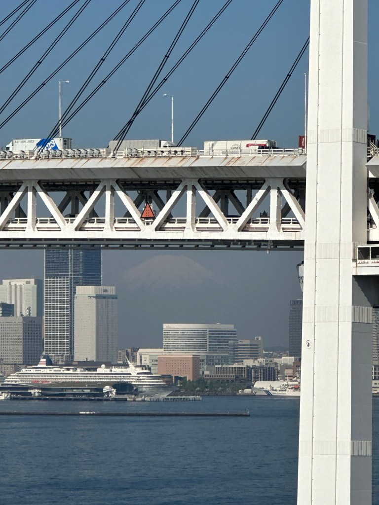 Blickrichtung Tokyo vom Anlegepunkt im Hafen von YokohamaGanz hinten erkennt man die Umrisse des Mount Fuji.
