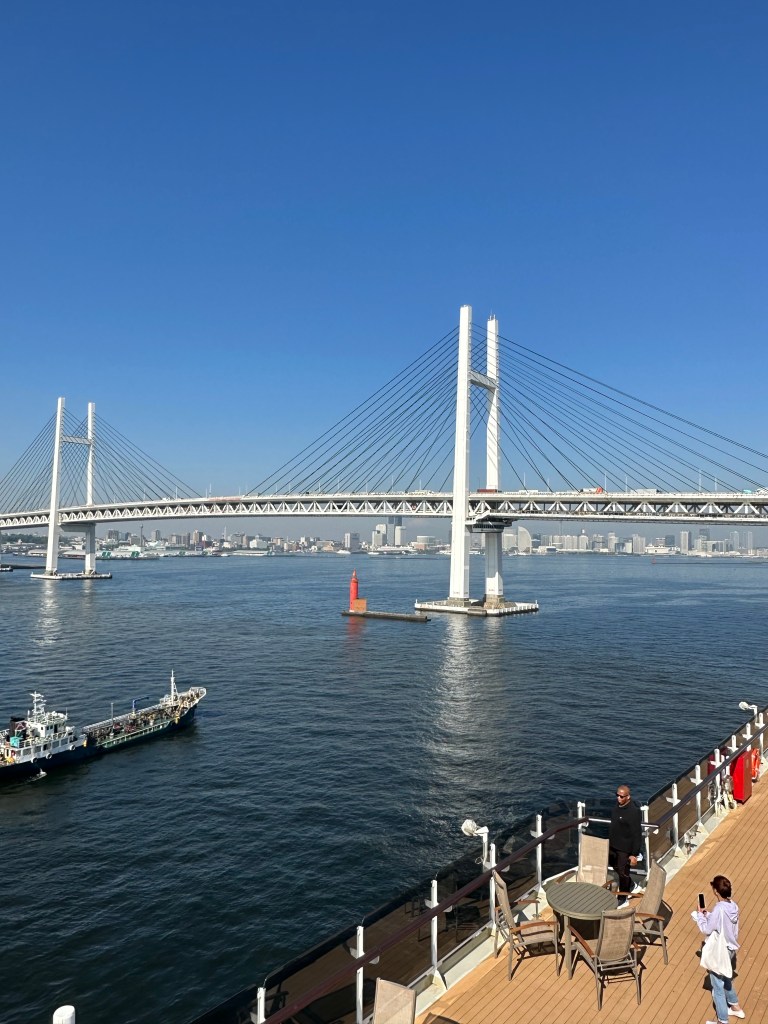 Strahlender Sonnenschein heute Morgen bei der Ankunft im Hafen von Yokohama. Der erste Blick nach aussen offenbart bereits das Gigantische, was uns in den nächsten Tagen auf Schritt und Tritt begleiten wird.
